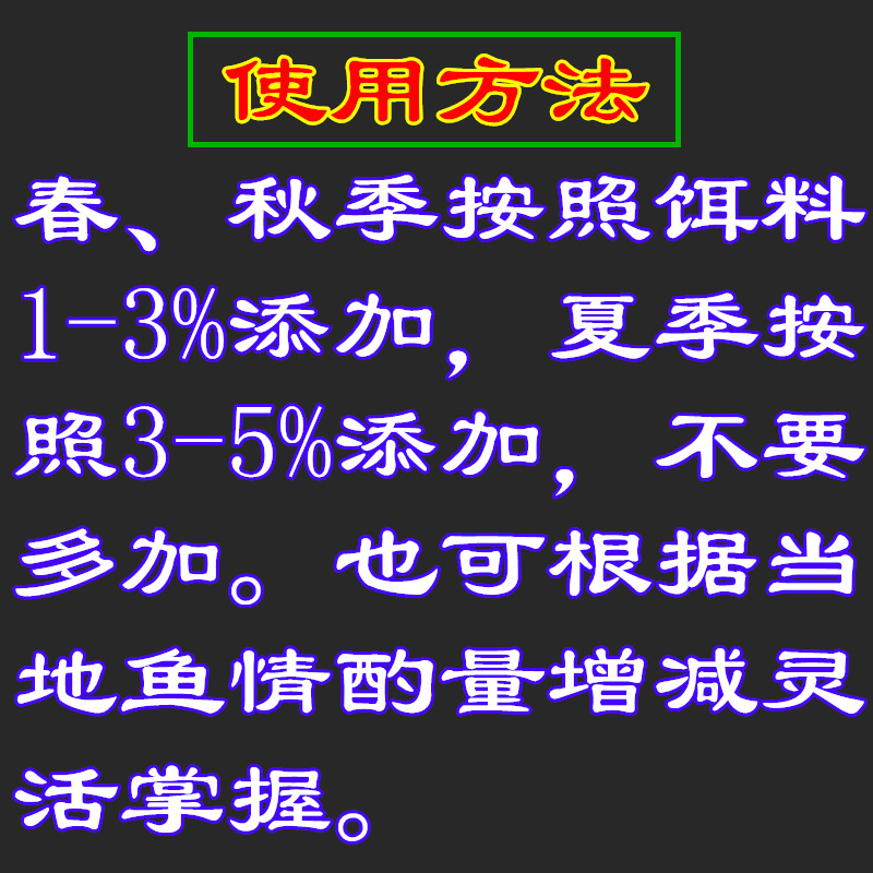 用法:按1%-3%的比例,先用原塘水、黑糖水或酒稀释后由少到多逐渐添加到饵料或窝料中,千万不要一次多加,味道太重容易造成鱼不进窝或死窝的现象。对钓鱼内行的顾客可以按照自己的方法自行调配。